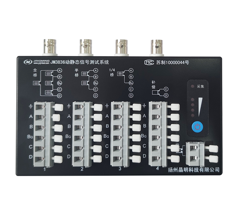 JM3836動靜態(tài)信號測試系統(tǒng),4通道/臺,每通道可以用于測應(yīng)變或測振動。測振動可配接電壓輸出型傳感器(拾振器)。儀器支持AC220V供電,也支持外接直流電源(蓄電池)供電,并且直流供電的范圍很寬,使用十分便捷,多臺儀器有線組網(wǎng)(采用易于制作的網(wǎng)線)測試時,可通過外接直流電源(蓄電池)供電線纜集中供電,方便了現(xiàn)場的布線。儀器每個測點橋路獨立設(shè)置,每臺儀器有一個補償片接入端子,可在軟件中分別為每個測點選擇補償片,現(xiàn)場測試方式更加靈活。每個測點有一個BNC輸入端子,設(shè)置為電壓輸入時可以直接連接如拾振器的電壓輸出型傳感器。儀器每個通道采用獨立24bits ADC,具有較高的信噪比,保證每個通道同步采集,多臺儀器組網(wǎng)時也能保證所有通道的同步性。
