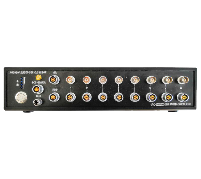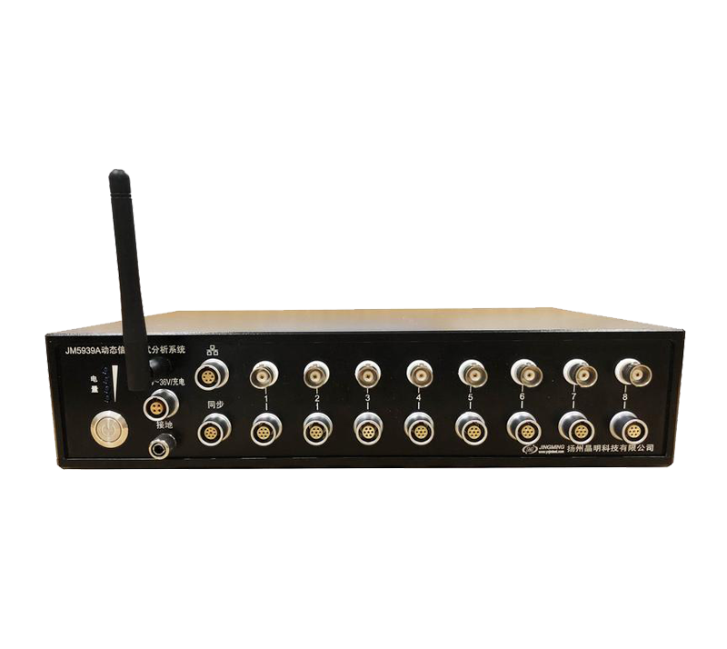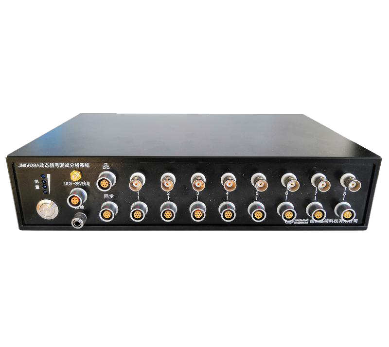JM5939A是一款高性能集信號調(diào)理及數(shù)據(jù)采集分析的堅固型多功能動態(tài)信號測試分析系統(tǒng)。系統(tǒng)采用WiFi網(wǎng)絡(luò)和LAN與計算機進行通訊,完成信號的調(diào)理和數(shù)據(jù)的采集。單臺設(shè)備支持8CH,系統(tǒng)多支持8臺設(shè)備同時工作,系統(tǒng)支持通過同步器實現(xiàn)同步工作。每通道內(nèi)置獨立的24bit ADC,保證每通道以不低于1kHz的采樣率同步采樣,這一性能使系統(tǒng)既適用于一般的信號采集應(yīng)用,也適用于較高要求的如模態(tài)測試等試驗場合。